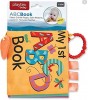 Libro con el abecedario de tela con páginas con relleno de celofán, tiras de satín, 1 link y 1 pieza para morder.