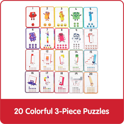 A medida que los niños ensamblen las piezas del puzzle, contarán los NumberBlocks y los NumberBlobs, identificarán los números de cada NumberBlock y desarrollarán el reconocimiento de los colores y la motricidad fina.