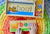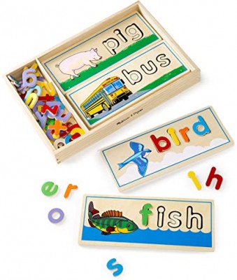 Más de 50 coloridas letras de madera caben en las 8 tablas de recorte de dos lados para deletrear palabras de tres y cuatro letras.